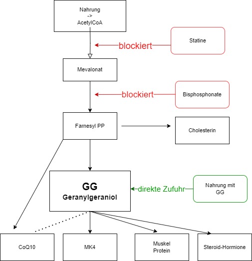 Einfluss durch Alterung, Statine, Bisphosphonate Hier sehen Sie (vereinfacht) wie wir zu unserem GG Geranylgeraniol kommen. Der obere Teil beschreibt, wie es aus der Nahrung aufgebaut wird, auf einem Weg, der auch das Cholesterin erzeugt. Sehr viele Menschen nehmen Statine, die diesen Weg blockieren - damit eben weniger Cholesterin aufgebaut wird. Leider wird dadurch auch der weitere Weg zum GG blockiert, wodurch auch CoQ10, Muskelprotein, Hormone blockiert werden. Das erklärt die häufigen Muskelprobleme durch die Statine.